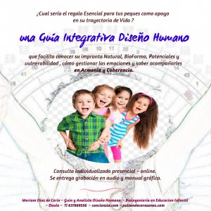 Añado la formación en Diseño Humano, orientada en los niños que llegan con otras configuraciones, es inminente. Hay que ayudarles a ver su potencial Genial.. Acompaño a las mujeres y familias en la maternidad consciente. También oriento la Educación para la Vida E.F.L. basada en valores expansivos, desde la escuela Ananda internacional. Mindfulness y Yoga Infantil y Maternal. Apoyo el sistema de educación Infantil S.E.I de Bioingenieria Cuántica. Comparto dinámicas C.N.V para una comunicación integrada.